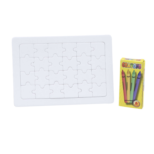 Divertente puzzle da 24 pezzi in colore bianco. Con scatola da 4 pastelli a cera nei colori giallo, verde, blu e rosso inclusi.