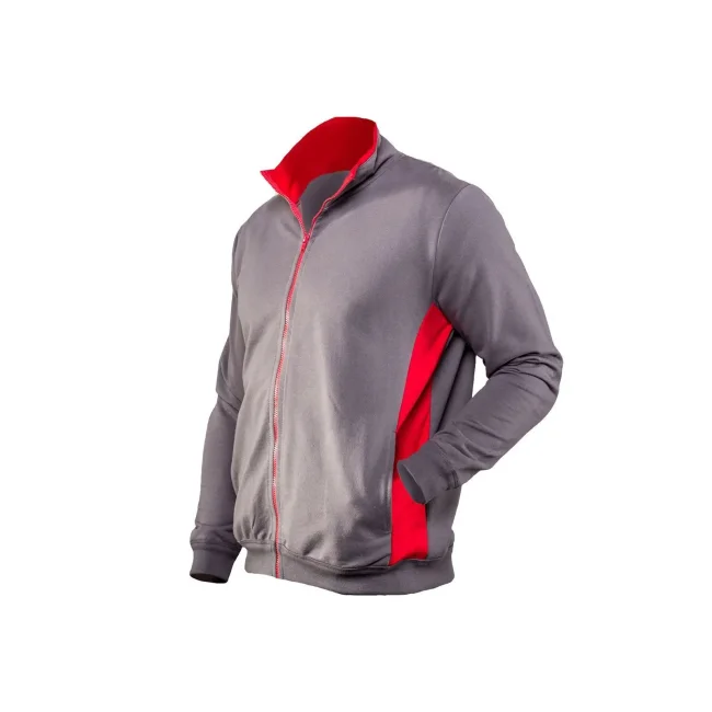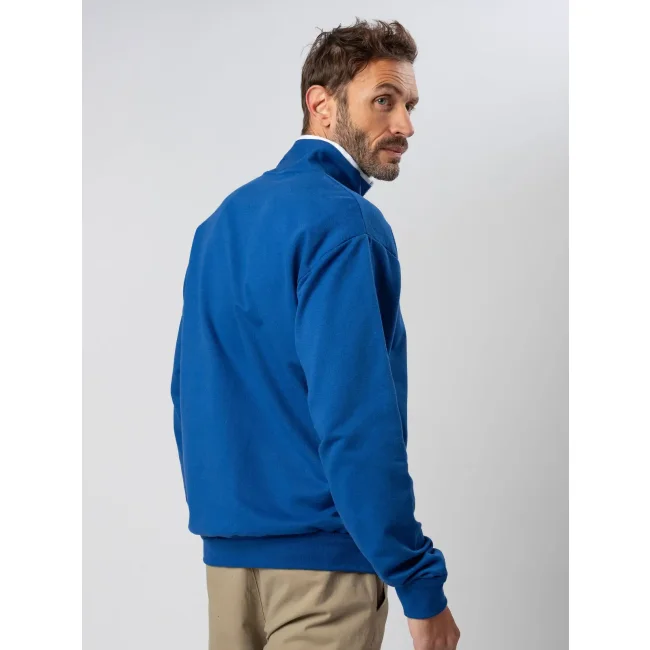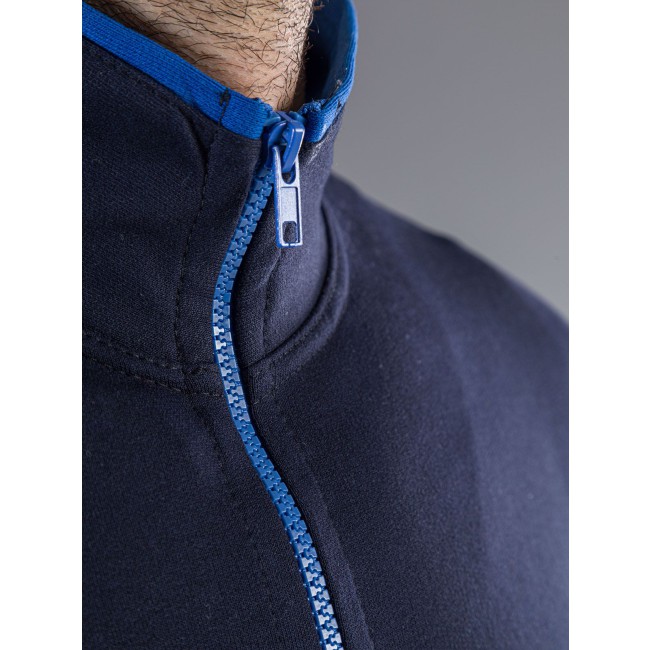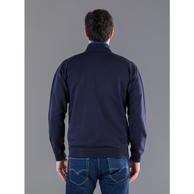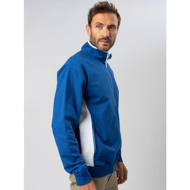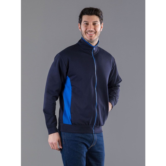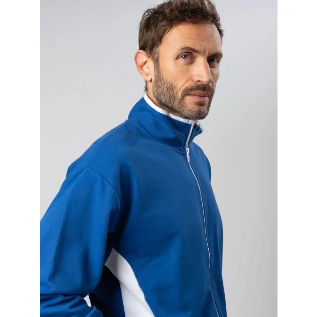 100% cotone. French terry. Felpa con zip intera bicolore, parte interna del collo, fianchi, interno tasca e cerniera di colore contrastante. Struttura con cuciture laterali, maniche set-in.