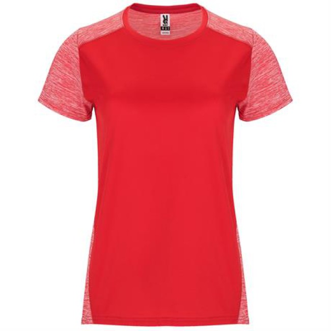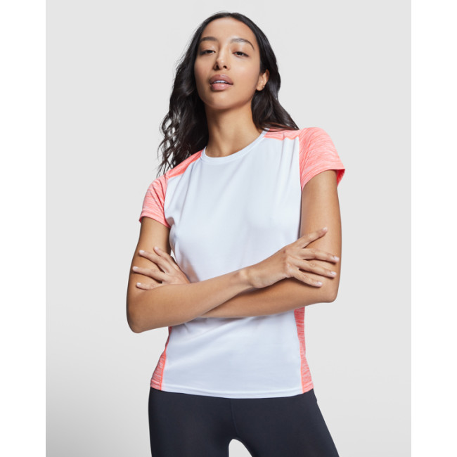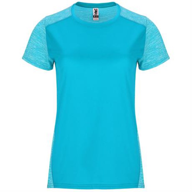 T-shirt tecnica manica corta per donna.1. Girocollo.2. Spalle e maniche con due tessuti di poliestere.3. Tessuto pricipale frontale a nido d'ape e tessuto space dye nella parte posteriore.4. Parte posteriore leggermente più lunga.