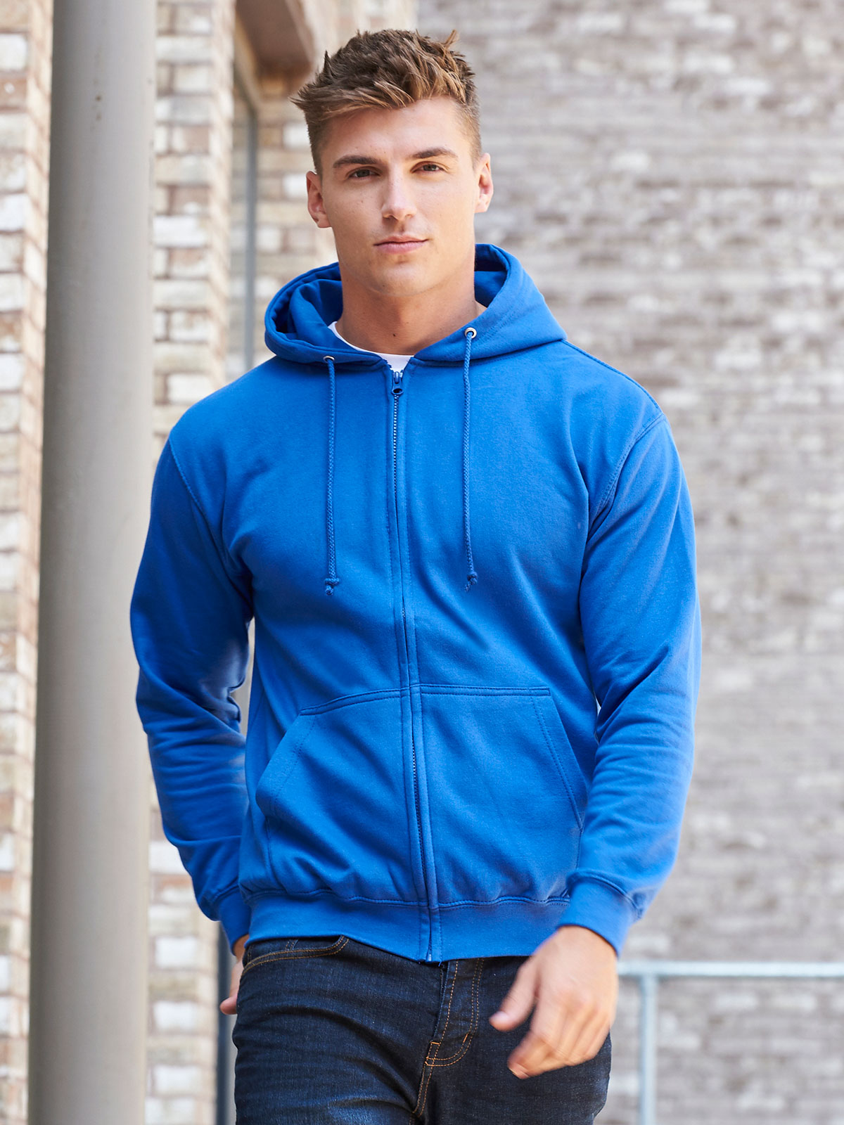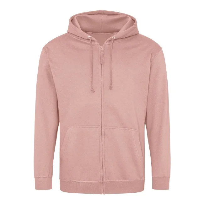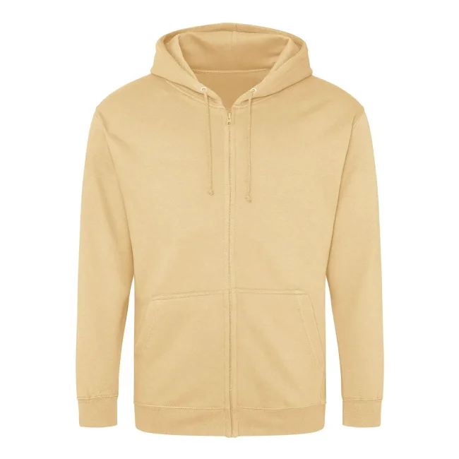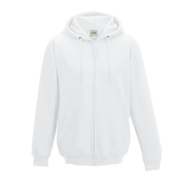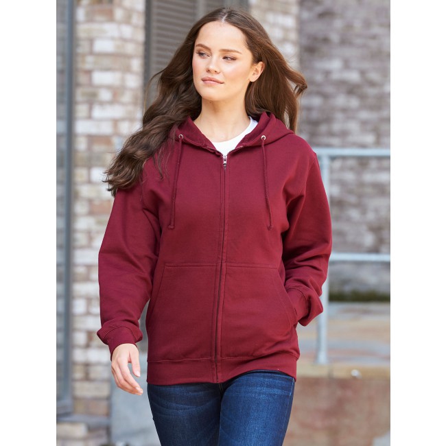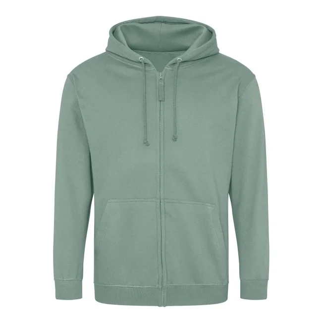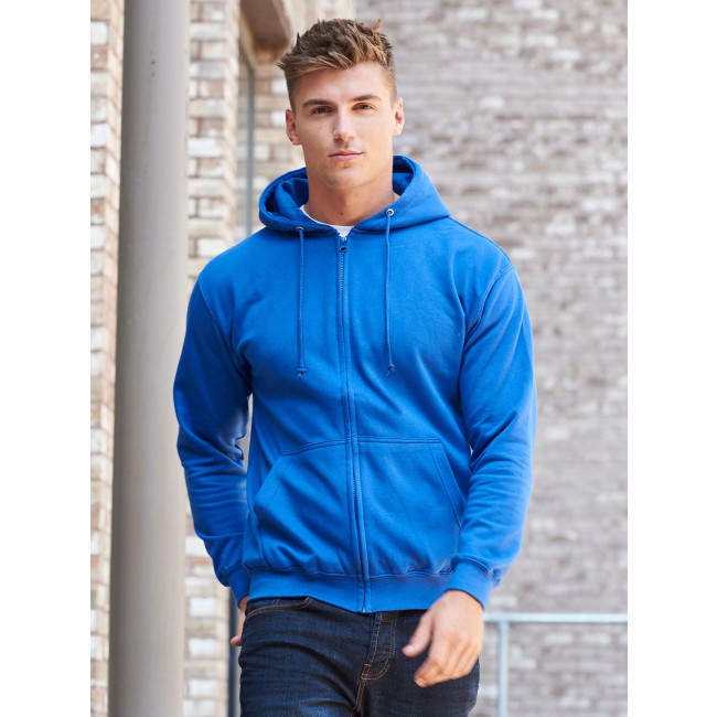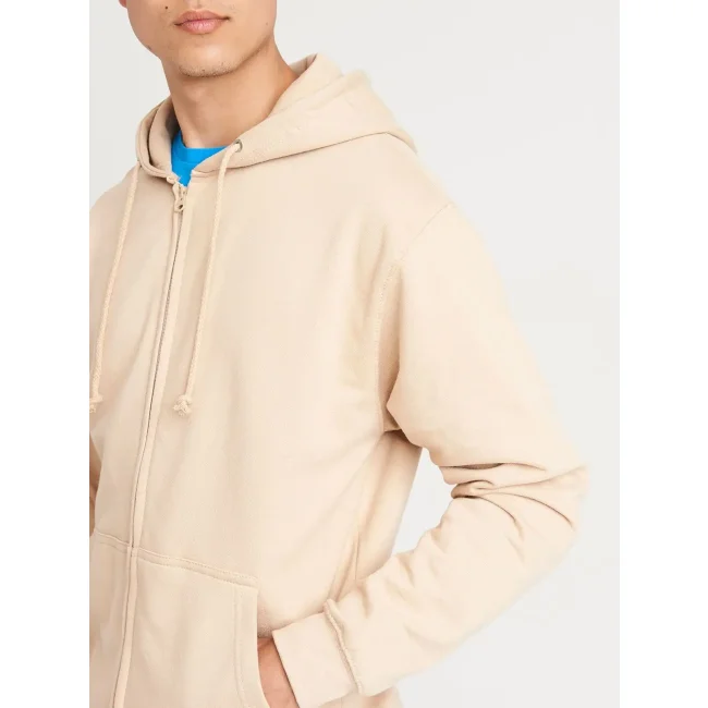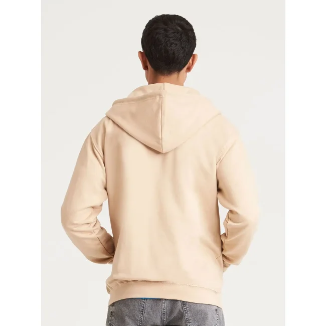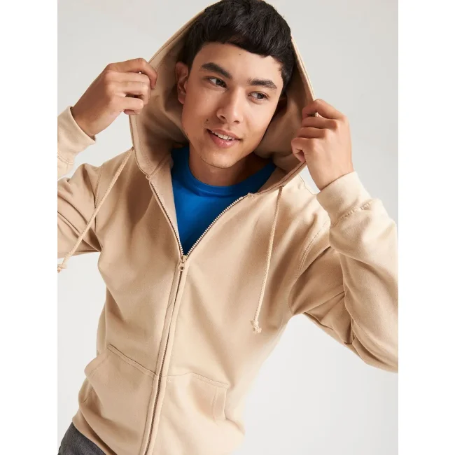 80% cotone, 20% poliestere. Felpa con cappuccio e zip intera coperta, doppie cuciture e cappuccio a doppio strato, tasca a marsupio, polsini e orlo a coste, etichetta strappabile. Produzione certificata WRAP (Worldwide Responsible Accredited Production)