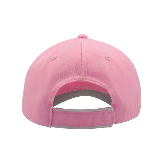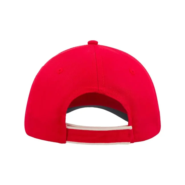 35% cotone 65% poliestere. Cappellino a 6 pannelli con visiera piping a contrasto in rilievo, sottovisiera a contrasto, chiusura con cinturino in tessuto e velcro, etichetta removibile, taglia unica.